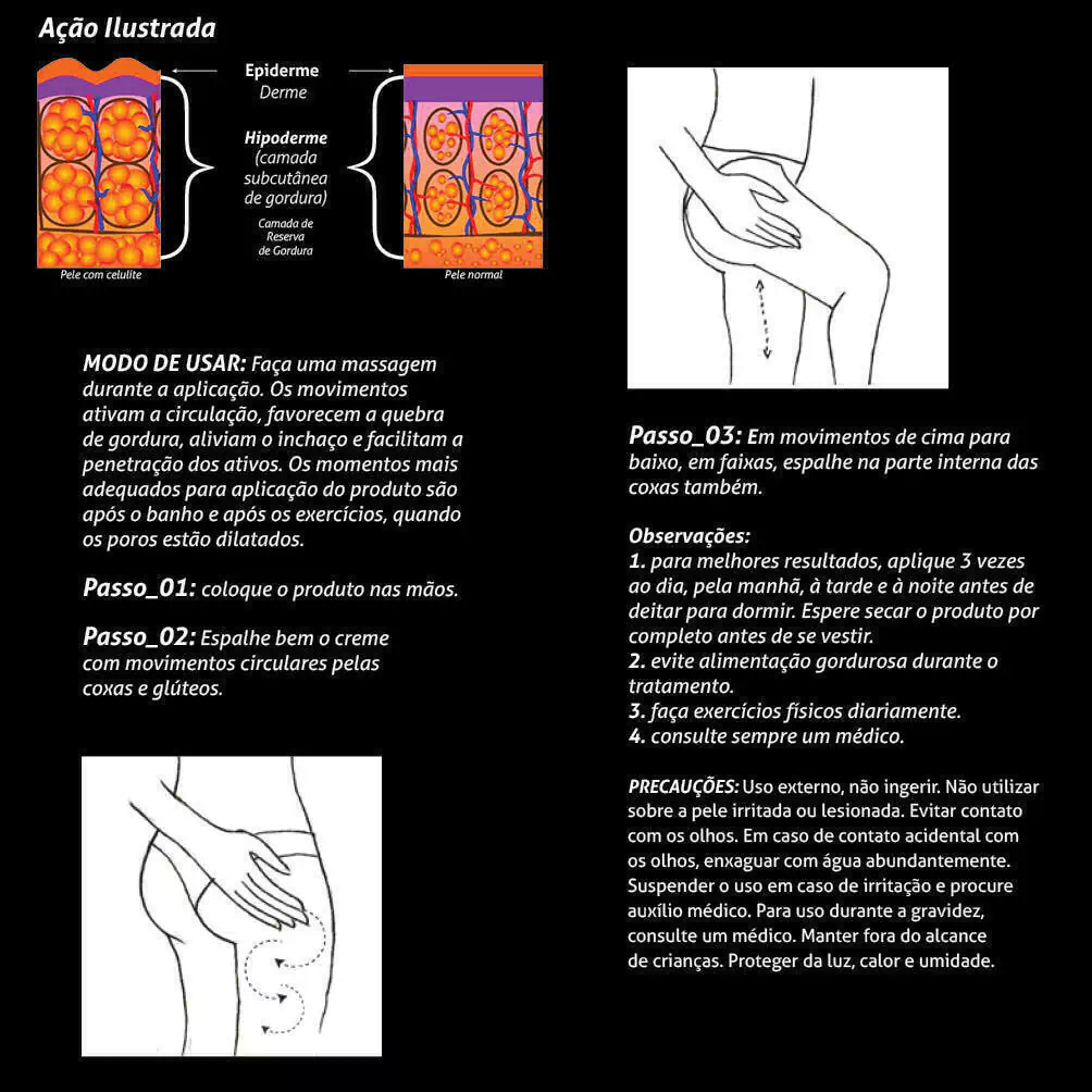 Como efeito adicional deixa a pele muito lisa, hidratada e macia. Sua fórmula trabalha com tecnologia avançada de nano ativos que penetram mais profundamente e agem por 8 horas seguidas, reduzindo as inflamações das células que estão na camada subcutânea de gordura e eliminando o aspecto ondulado. Muito concentrado seu rendimento é excelente.