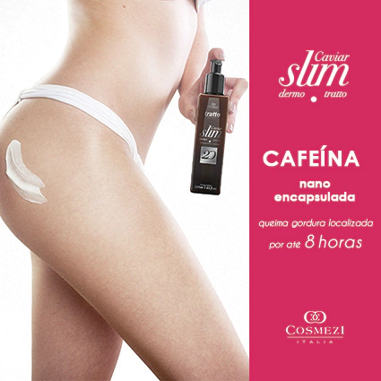 O Caviar Dermo Slim é um creme redutor de medidas feito para todos os tipos de pele. Atua na quebra as moléculas de gordura com alta eficiência. Testes clínicos registrados mostram eficácia percebida de até 67% de redução da aparência “casca de laranja” em 7 dias e redução de 83% da celulite.